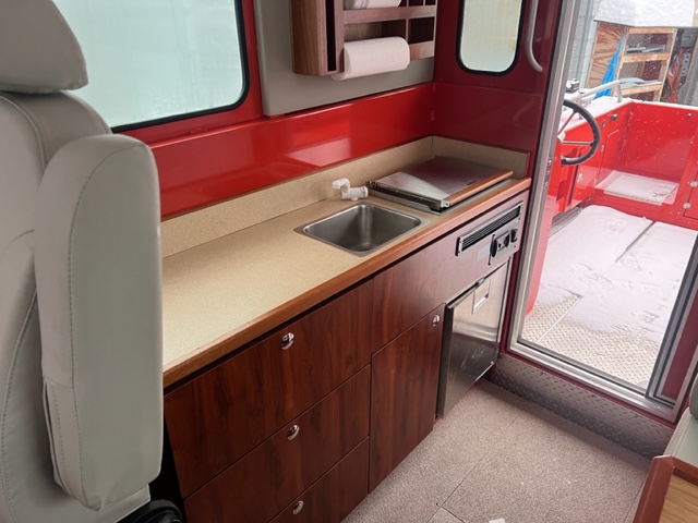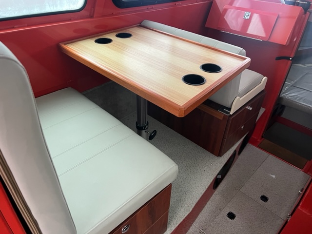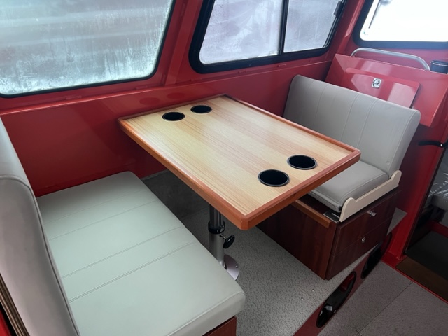 • Configuration #7 MLC: Starboard truck seat, Port Dinette bed combo, reversable bench seat. Galley with cooktop / heater combo, 12v refridgerator,Storage Drawers, dish rack, Full Dinette & Marine Head (head opens into cabin)