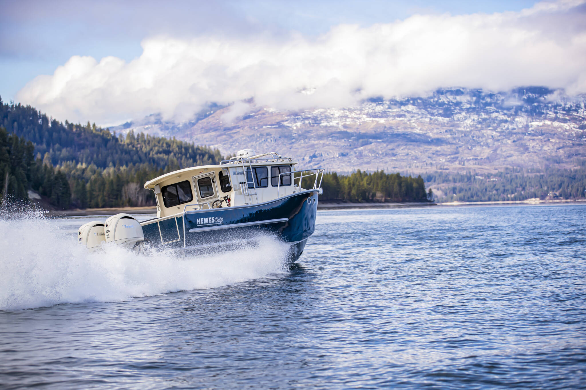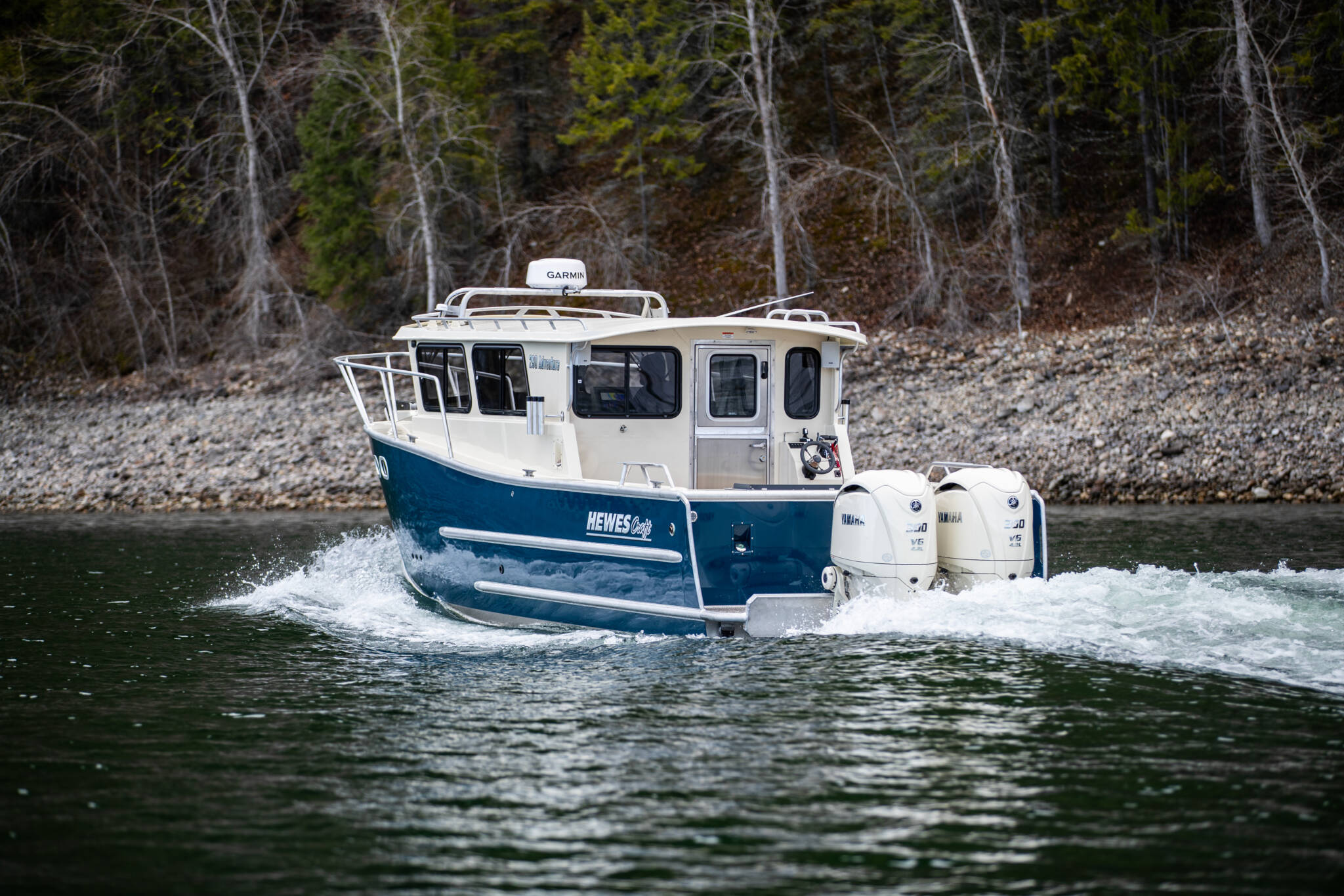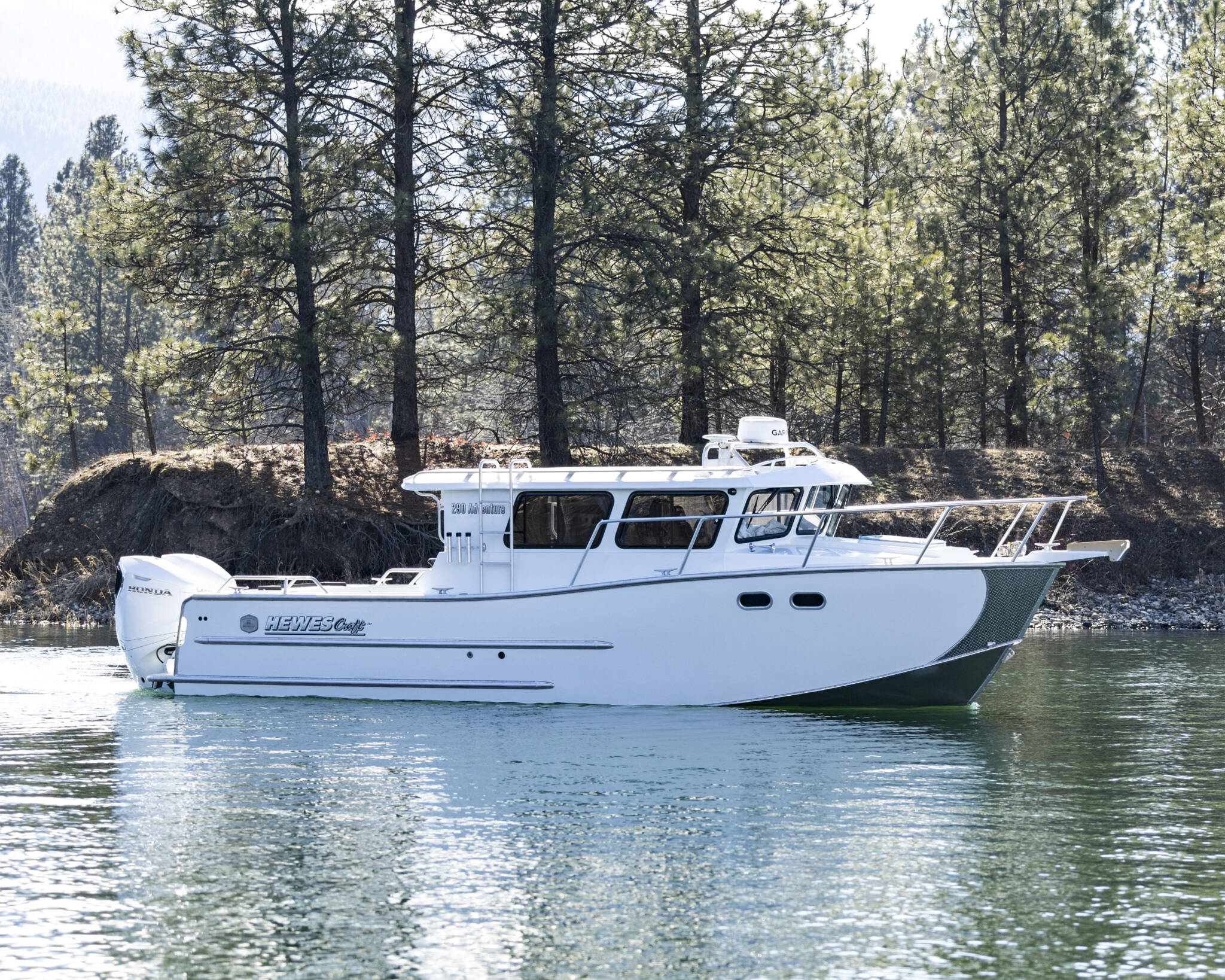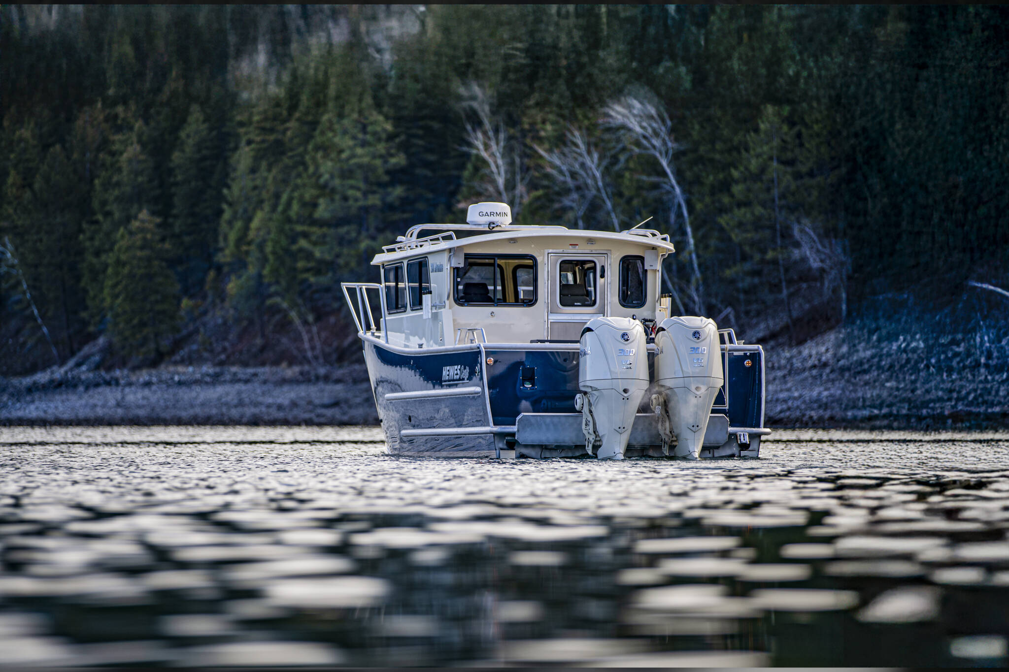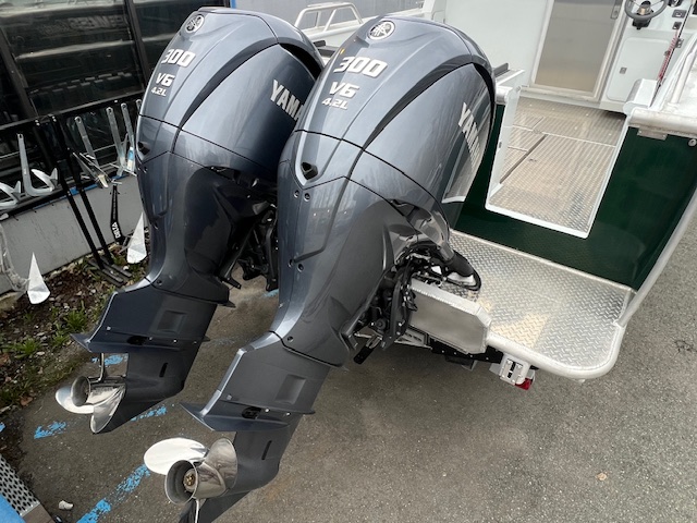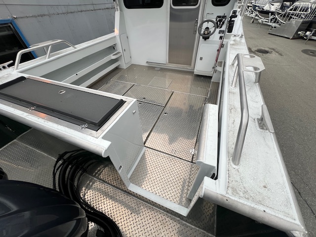 • Transom: Extended, twin 30” shaft engines, 25” starboard kicker step standard