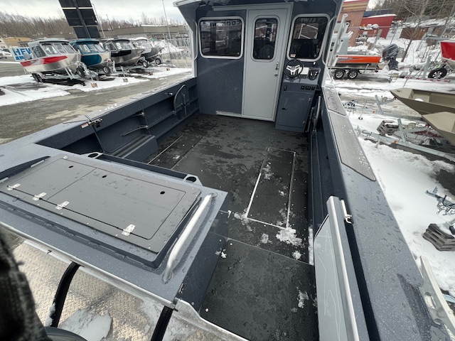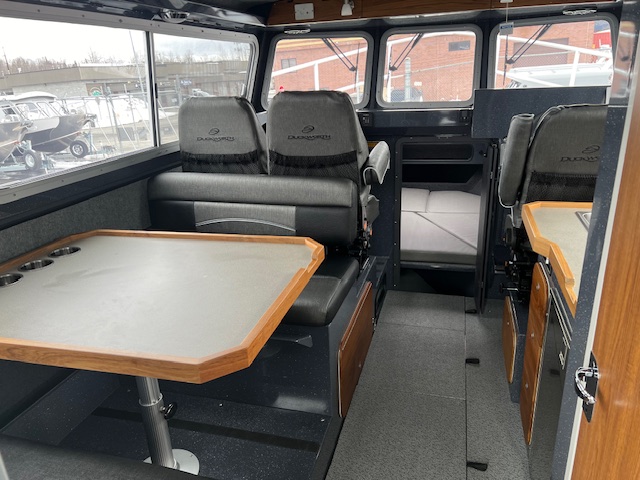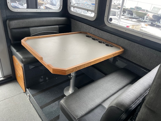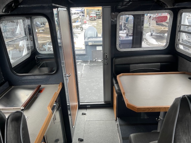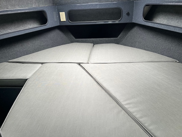• Cuddy cabin with 24″ bow access hatch, storage, shelving, cushions, and 2 LED red/white cabin lights