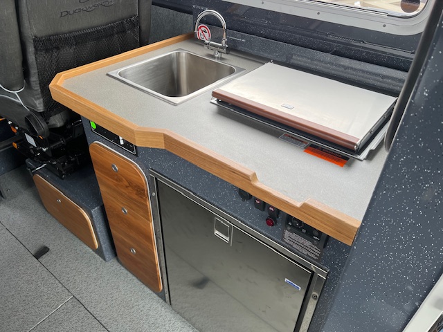 • Galley with sink, faucet, 12V/110V drawer fridge, and 21 gal. freshwater tank w/ tank level monitoring system