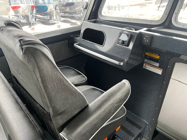 • Driver dash w/stainless steel LED switches, fuel gauge, trim tab controls, 4- USB ports, and room for 2-12″ flush mount screens