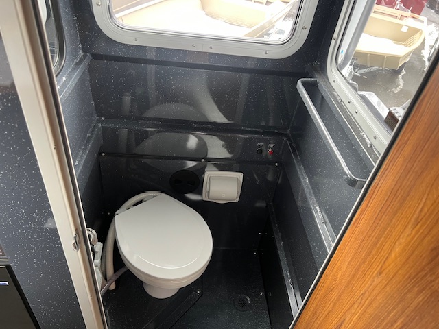• 3-window head w/floor drain, electric toilet, 21 gal. holding tank, overboard discharge, and curtain package