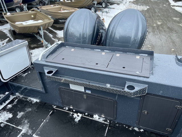 • Transom w/ insulated 42-gallon fish box, cutting board lid & locking rigging compartment doors
