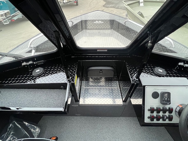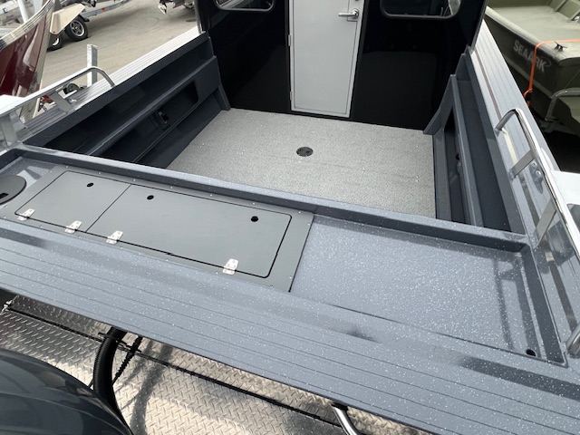 • Fishermen’s transom with livewell, self draining utility area, 2 piece cutting board hatch lid and framed rigging access panels